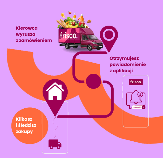 W dniu dostawy otrzymujesz od nas wiadomość email, że Twoja dostawa wyjechała z naszego magazynu. Poprzez funkcję śledzenia zamówień informujemy Cię, że kierowca Frisco rozpoczął realizację Twojego zamówienia i zmierza pod wskazany adres dostawy.