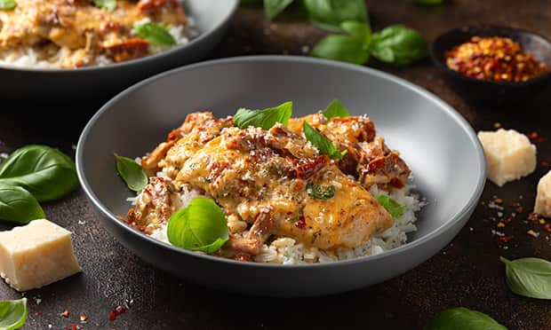 1. Ugotuj ryż wg instrukcji na opakowaniu. Kurczaka pokrój w 3 cm paski, cukinię w półplastry, suszone pomidory w paski
