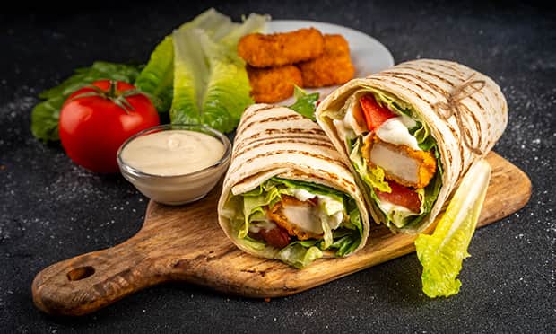 5. Wrapy podgrzewaj kolejno na suchej dużej patelni, na każdym układaj ¼ dodatków, sosu, kurczaka, dokładnie zwiń.