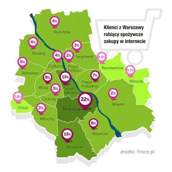 Prawie co czwarta osoba z Warszawy, która kupuje jedzenie w internecie mieszka na Mokotowie – wynika z badania opracowanego przez e-supermarket Frisco.pl. Kolejne miejsca w stawce zajmują mieszkańcy Ursynowa i Śródmieścia (po 13%). Te trzy dzielnice przodują nie tylko pod względem liczby klientów, ale też liczby zamówień, łącznie trafia tam bowiem ponad połowa e-koszyków z żywnością, kosmetykami i chemią gospodarczą. Najczęstszy paragon warszawiaka za spożywcze zakupy w e-supermarkecie to ok. 255 zł.