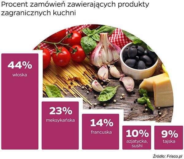 Kuchnia włoska jest najpopularniejszą kuchnią zagraniczną wśród osób robiących spożywcze zakupy w sieci – wynika z danych internetowego supermarketu Frisco.pl. Produkty z Półwyspu Apenińskiego pojawiały się w niemal połowie (44%) koszyków klientów e-sklepu w całym 2014 roku. Na kolejnych miejscach uplasowały się produkty kulinarne typowe dla Meksyku (23% zamówień), Francji (14%), wyroby związane z kuchnią azjatycką, w tym głównie z sushi (10%) oraz żywność tajska (9%).