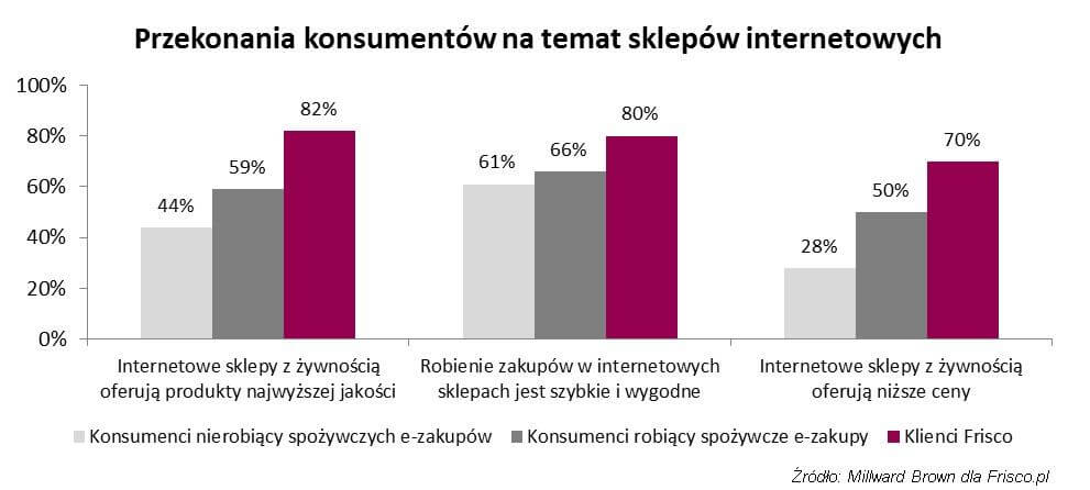 Jak pokazują wyniki badania przeprowadzonego przez Millward Brown na zlecenie Frisco, poglądy dotyczące zakupów spożywczych przez Internet znacznie różnią się pomiędzy osobami korzystającymi z oferty e-sklepów a konsumentami, którzy nie mają jeszcze za sobą takiego doświadczenia. Aż 72% osób dotąd niekupujących żywności w sieci nie jest przekonanych, że sprzedawane przez Internet produkty są tańsze niż w sklepach tradycyjnych, a ponad połowa (56%), że są to jakościowe towary. Jednocześnie 39% badanych w tej grupie nie zgadza się ze stwierdzeniem, że e-zakupy są szybkie i wygodne. Zdecydowanie lepiej te kwestie postrzegają klienci e-supermarketów. Aż 59% z nich uważa, że e-sklepy oferują artykuły spożywcze najwyższej jakości, połowa jest zdania, że ceny w internetowych marketach są bardziej atrakcyjne niż poza siecią, zaś 66% respondentów z tej grupy potwierdza, że wirtualne zakupy można zrobić sprawnie. Jeszcze korzystniej zamawianie produktów spożywczych w sieci oceniają klienci Frisco.pl – z jakości zadowolonych jest aż 82% z nich, z szybkości i wygody takiej formy zakupów - 80%, a z cen - 70%.