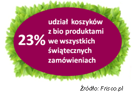 Bio żywność coraz częściej trafia na wielkanocne stoły Polaków. Jak pokazują dane internetowego supermarketu Frisco.pl, sprzedaż eko warzyw, wyrobów nabiałowych czy wędlin zamówionych w tym e-sklepie była w okresie przedświątecznym w 2015 roku o niemal 10% wyższa niż w tym samym czasie rok wcześniej, a produkty ekologiczne znajdowały się w blisko co czwartym koszyku zakupowym. Popyt na ekologiczne jajka w ujęciu rok do roku zwiększył się wówczas o 28%, w przypadku eko kiełbas było to 18%. Jeszcze wyraźniejszy wzrost popularności zanotowała zaś bio rzodkiewka, której sprzedaż rok do roku podwoiła się. Rosnące zainteresowanie bio żywnością Frisco.pl obserwuje również przed tegorocznymi świętami.