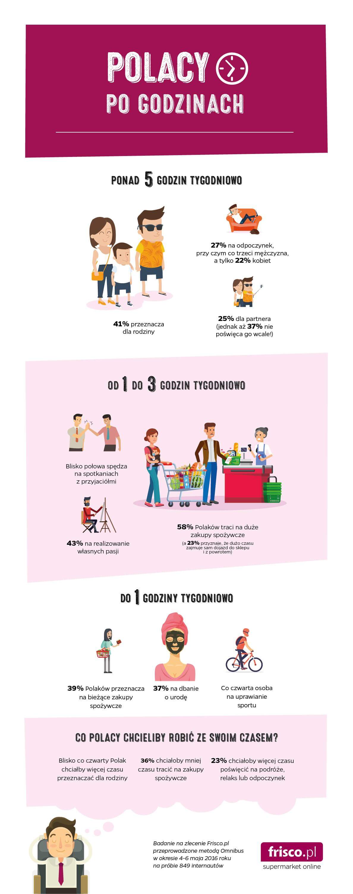 41% Polaków deklaruje, że dla rodziny przeznacza ponad 5 godzin tygodniowo, jednak co piąty przyznaje, że chciałby tego czasu poświęcać jeszcze więcej – wynika z badania Frisco.pl „Polacy po godzinach”. Dodatkowo, narzekamy na brak czasu na realizację własnych pasji, odpoczynek czy podróże. Co pochłania czas Polaków poza pracą? Ile poświęcają go dla przyjaciół, a ile na obowiązki domowe?