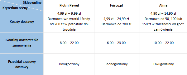 Elastyczność i cała logistyka związana z dostawą jest kluczowym aspektem funkcjonowania sklepów online i utrzymania zadowolenia klientów. W badaniu zwrócono uwagę na wiele czynników wpływających na poprawę komfortu podczas odbioru zamówienia. Na ich podstawie pierwsze miejsce zajął Piotr i Paweł zdobywając maksymalną liczbę punktów. Wynika to ze zwolnienia z opłaty dwóch dni w tygodniu oraz najniższych kosztów dostarczenia w pozostałe dni tygodnia, a także możliwości realizacji zamówienia codziennie w godz. 8-22. Na drugim miejscu znalazło się Frisco.pl, w którym dostawa jest darmowa dla zamówień powyżej 200 zł, a przy pierwszym zamówieniu już od 100 zł, natomiast dowóz zakupów odbywa się codziennie w godz. 6-23. Przewagę nad innymi sklepami online stanowi także możliwość precyzyjnego wyboru godziny dostarczenia towarów (np. 11-12), podczas gdy w innych sklepach te przedziały są 2-godzinne (np. 11-13). Na trzecim miejscu uplasowała się Alma, oferująca dostawy od poniedziałku do niedzieli w godz. 10-22.