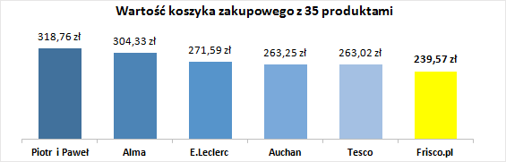 Wartość koszyka zakupowego stanowi jeden z najważniejszych czynników, który zdecydował o wygranej Frisco.pl w rankingu. Między badanymi sklepami online powstały istotne różnice w cenie przy zamówieniu identycznego koszyka z 35 produktami. W tej kategorii Frisco.pl zdecydowanie wyprzedziło inne sklepy zdobywając najwyższą notę w skali. Drugie miejsce zajęło Tesco, a różnica w cenie za zakupy między nimi wyniosła ponad 23 zł. Najwyższy rachunek musielibyśmy zapłacić w sklepie Piotr i Paweł, gdzie wartość koszyka w porównaniu z Frisco.pl byłaby o 80 zł wyższa. Wynik ten jest efektem zmian w polityce cenowej, jakie Frisco.pl wprowadziło w ostatnich miesiącach, tym samym plasując się cenowo na poziomie hipermarketów czy dyskontów.