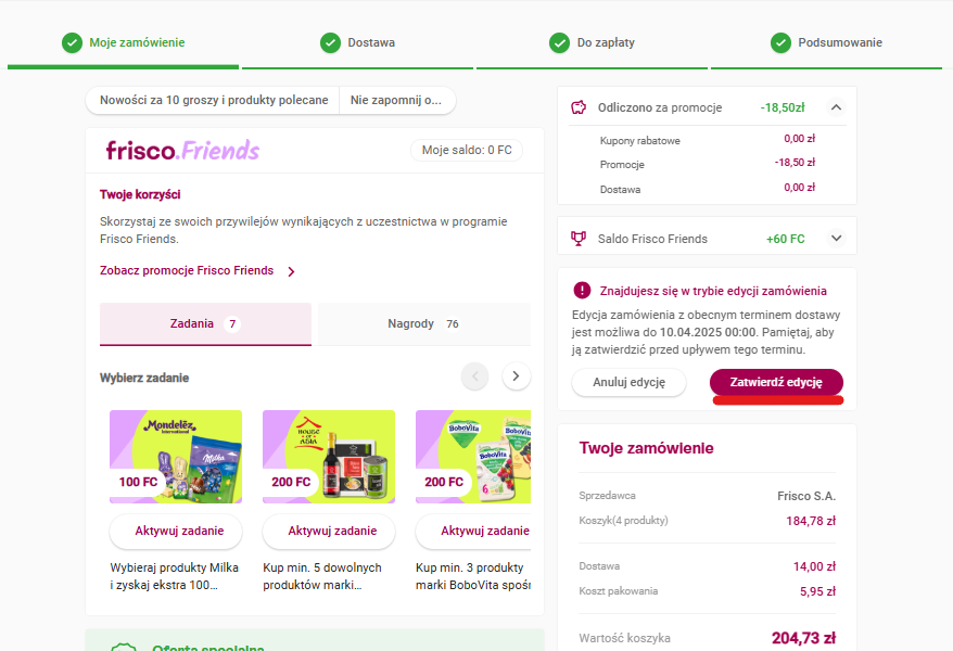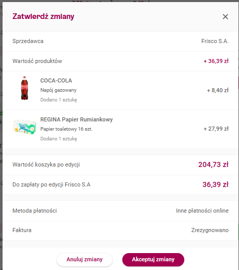 Jeżeli nie zgadzasz się na modyfikację, możesz anulować edycję zamówienia poprzez przycisk "anuluj zmiany".